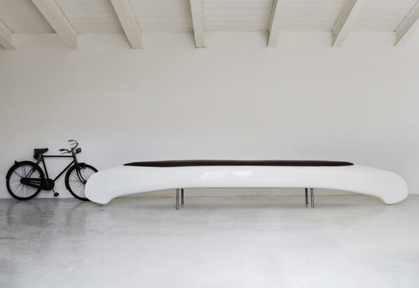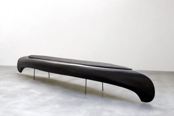 Bancă din fibră de sticlă, scaun tapițat în piele, bază din oțel inoxidabil.