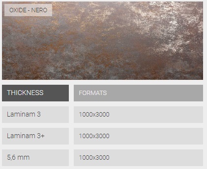 Printr-o tehnologie unică de stratificare, suprafețele Oxide reproduc efectul metalului oxidat care reacționează la agenții atmosferici, la soare și la trecerea timpului. Adâncimile materiale și cromatice ajuta la crearea de noi efecte 3D rafinate pentru o privire totală în proiectarea de interioare și exteriori în orice stil, de la cele mai clasice până la cele mai extreme.