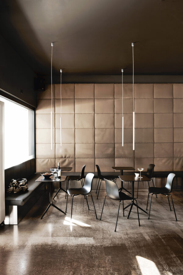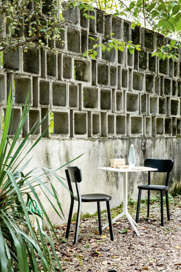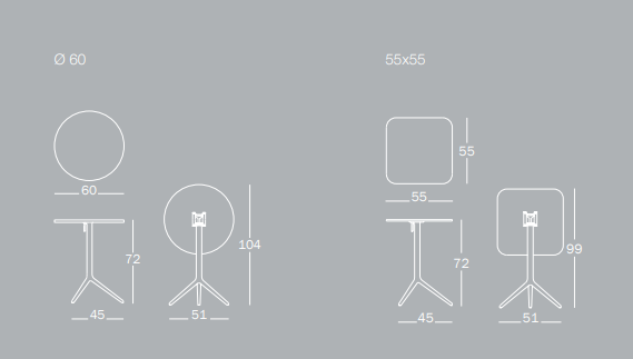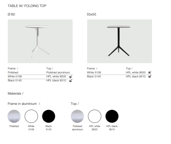 Material: cadru din aluminiu turnat sub presiune lustruit sau vopsit in rasina epoxidica. Blat din aluminiu lustruit sau din HPL. Disponibil cu blat rotund sau pătrat rotunjit.